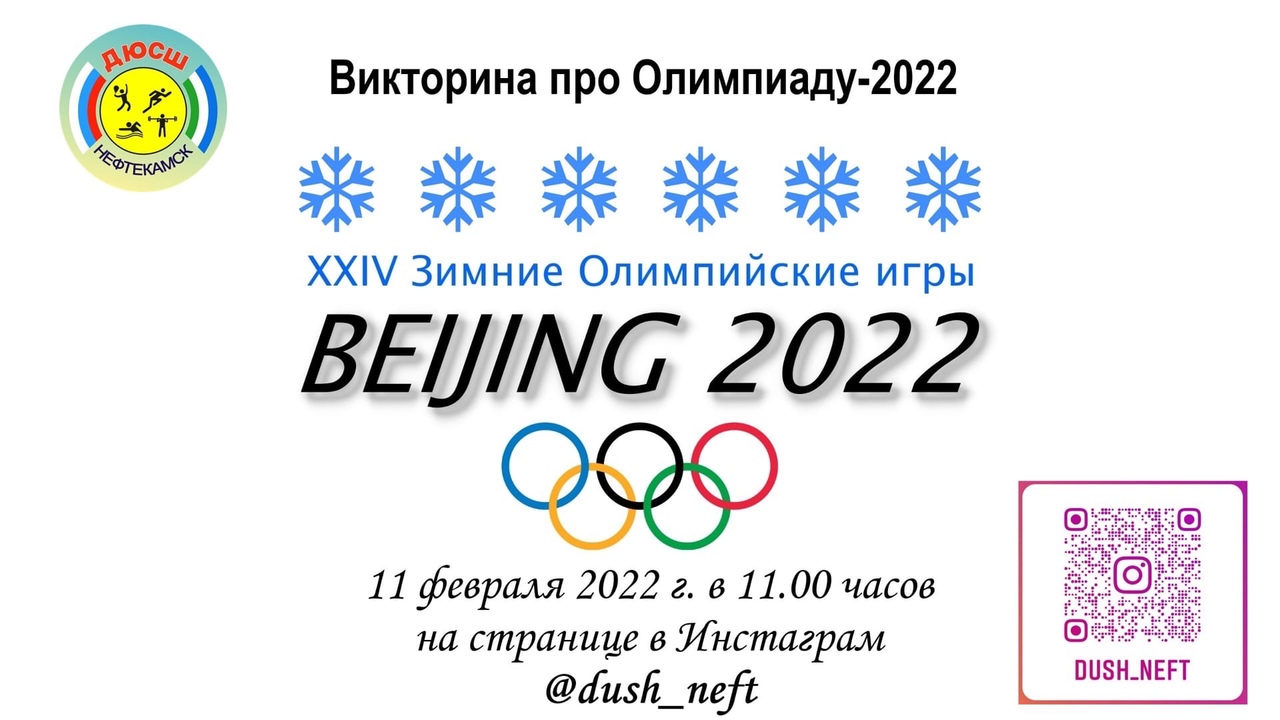 МБУ ДО Детско-юношеская спортивная школа ГО г.Нефтекамск приглашает принять участие в онлайн-викторине XXIV Зимние Олимпийские игры - 2022, которая состоится 11 февраля 2022 года в 11.00 часов в сторис Инстаграм @dush_neft .