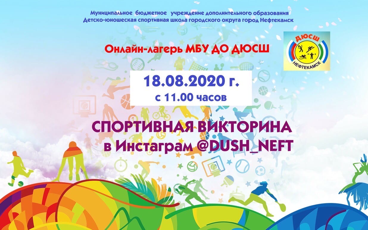 18 августа 2020 года на странице Инстаграм МБУ ДО ДЮСШ прошла онлайн-викторина «В мире спорта». Всего было 15 вопросов по теме «Спорт» 14 из которых были с вариантами ответов, а ответ на заключительный 15-й вопрос нужно было вписать самостоятельно. На вопросы викторины ответили 117 человек. Победители, призёры, а также участники были награждены грамотами МБУ ДО ДЮСШ. Поздравляем!