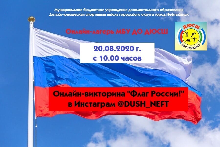 В Честь празднования Дня Государственного флага Российской Федерации, 20 августа 2020 года МБУ ДО ДЮСШ приглашает всех желающих пройти онлайн-викторину «Флаг России!», который будет проходить на странице Инстаграм @dush_neft. Вас ждут 10 вопросов: 9 вопросов с вариантами ответов и ответ на крайний вопрос нужно вписать самостоятельно. Викторина будет доступна в течении 24 часов. Для подведения итогов желающим получить грамоту о прохождении викторины нужно вписать свою Фамилию Имя и Фамилию своего тренера ДЮСШ. Желаем удачи! #деньфлагарф #дюсшнефтекамск