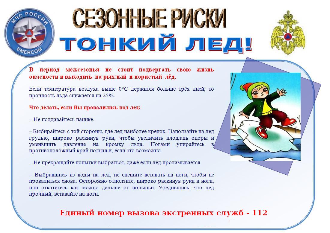 Сейчас необходимо помнить, что весенний лед очень коварен, солнце и туман задолго до вскрытия водоемов делают его пористым, рыхлым, хотя внешне он выглядит крепким. Такой лед не способен выдержать вес человека, не говоря уже о транспортных средствах. Период половодья требует от нас порядка, осторожности и соблюдения правил безопасности поведения на льду и воде. Несмотря на все меры, принимаемые властями и службами, каждый человек сам отвечает за свою жизнь и безопасность на водных объектах. Нельзя выходить на водоемы при образовании ледяных заторов. Не пользуйтесь не санкционированными переходами по льду. Опасно находиться на весеннем льду водохранилищ. Переходить водоемы весной строго запрещается. Особенно недопустимы игры на льду в период вскрытия рек. Прыгать с льдины на льдину и удаляться от берега недопустимо. Такие поступки, как правило, заканчиваются трагически. Поэтому не следует забывать: - на весеннем льду легко провалиться; - быстрее всего процесс распада льда происходит у берегов; - весенний лед, покрытый снегом, быстро превращается в рыхлую массу. В период весеннего паводка и ледохода запрещается: - выходить в весенний период на водоемы; - переправляться через реку в период ледохода; - подходить близко к реке в местах затора льда, - стоять на обрывистом берегу, подвергающемуся разливу и обвалу; - собираться на мостиках, плотинах и запрудах; - приближаться к ледяным заторам, - отталкивать льдины от берегов, - измерять глубину реки или любого водоема, - ходить по льдинам и кататься на них., - кататься на горках, выходящих на водные объекты.