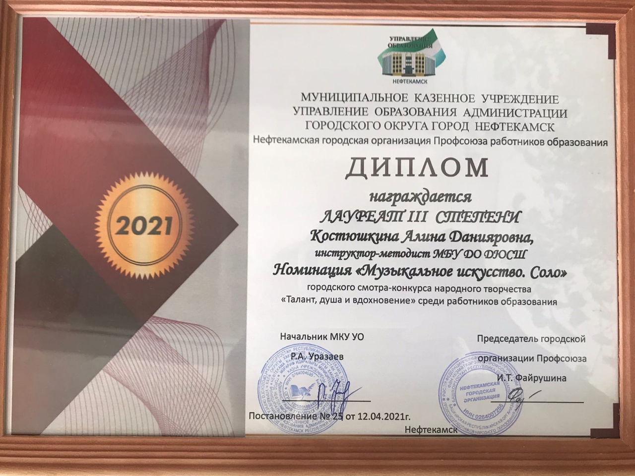 8 апреля 2021 года на базе Дворца творчества прошёл Городской смотр-конкурс народного творчества «Талант, душа и вдохновение» среди работников образования. Нашу ДЮСШ в номинациях «Художественное слово» и «Музыкальное искусство. Соло» в этом конкурсе представили тренер-преподаватель Коробейникова Татьяна Витальевна и инструктор-методист Костюшкина Алина Данияровна. По результатам оценки жюри 3 место в номинации «Музыкальное искусство. Соло» с участием воспитанниц ДЮСШ команды «Арт-Данс» заняла Алина Данияровна Костюшкина. Поздравляем!